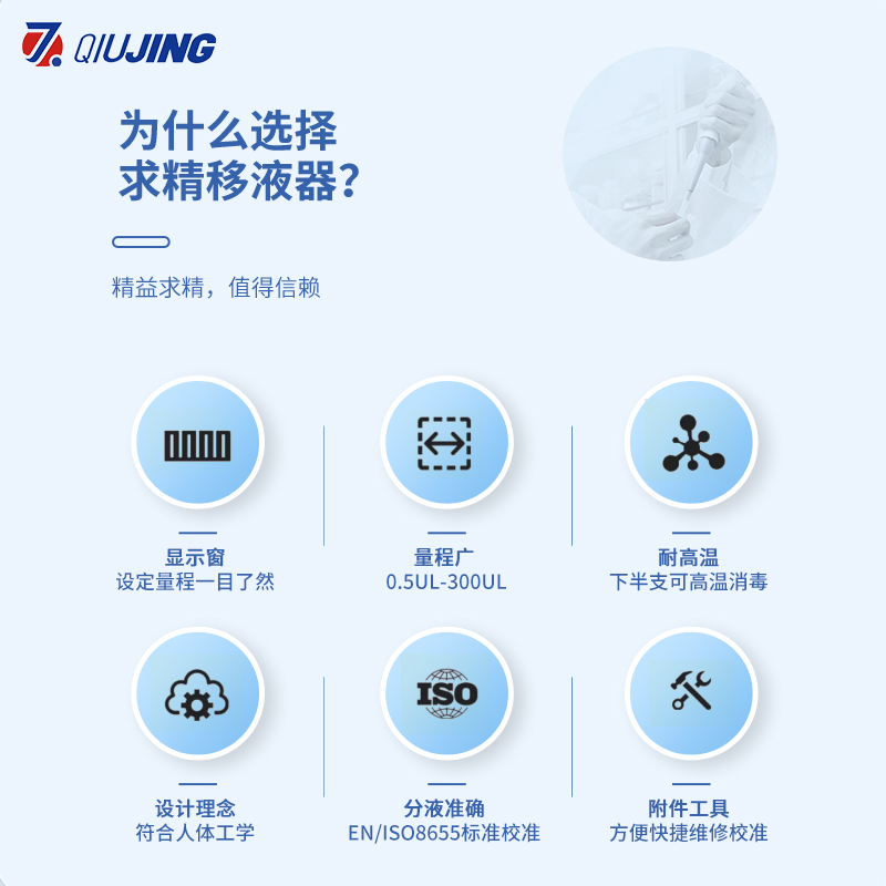 在当今社会移液器的使用十分普遍,移液器使用起来很舒适,而且更人性化。与量筒相比,处理危险化学品更安全。移液器更加准确,可在输送溶液时进行精确测量。移液器通过节省时间来提高实验室的工作效率。多通道移液器是高通量实验的高精度高效率和可重复性的理想选择。它可用于各种液体,包括泡沫液体、高蒸气压液体和高粘度液体。求精品牌新升级的LUCKY系列移液器分为单通道以及8通道,12通道多功能移液器。设计具有符合人体工程学量程从最小0.1ul最大10mI范国更广,精度更加可靠的特性,更能满足现代实验室的多样化应用需求。抗冲击、耐UV以及化学腐蚀,更能满足长期稳定的移液工作,并且管嘴部件采用特定材料,可以拆装支持高温高压灭菌,支持自主量程校准等等优点。
